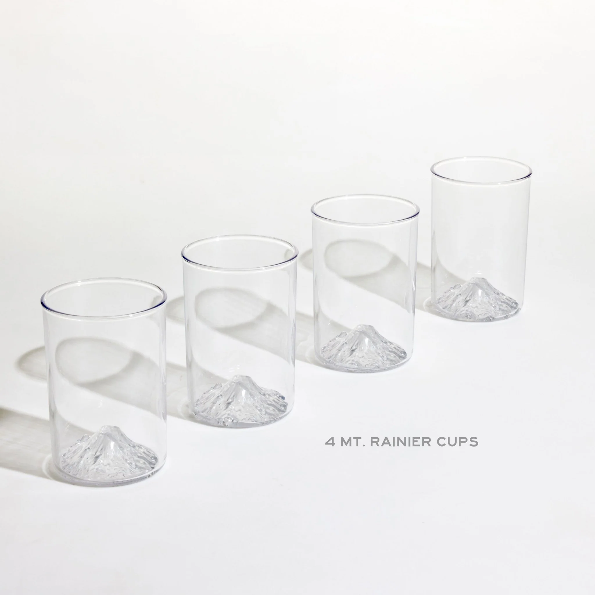 Set of four unbreakable plastic 12oz cups featuring accurate 3D Data of Mt. Rainier standing at 14,411 ft molded into the base of the cup.