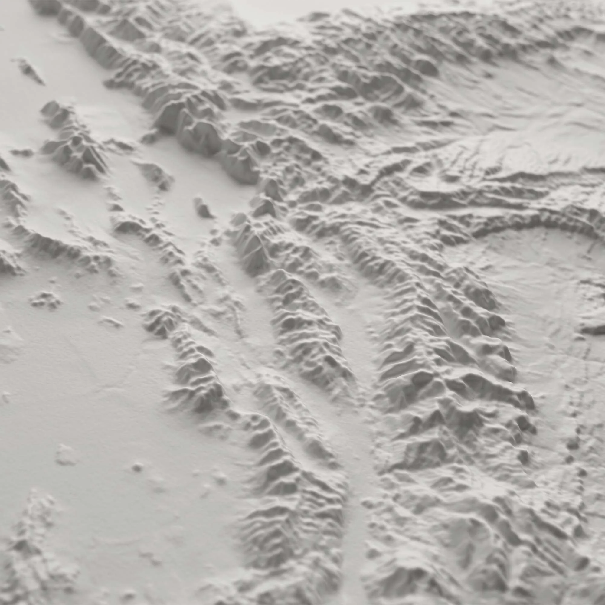 Simplicity at its finest, the map is completely white with no print or text on it to enhance the visibility of the complex terrain. It is best observed near a light or window to increase the shadows. The angle and brightness of the light will determine the intensity of shadows produced on the map.