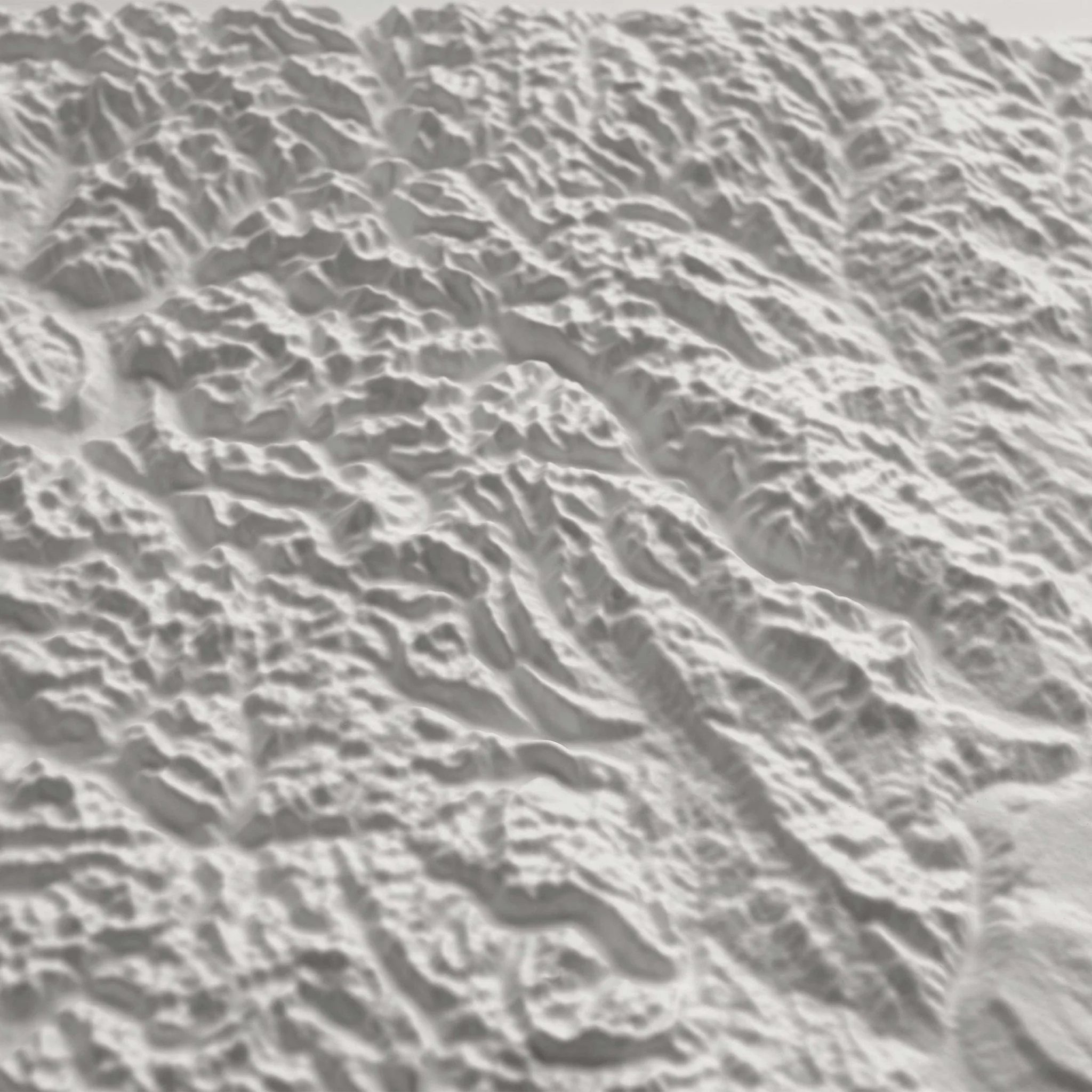 Simplicity at its finest, the map is completely white with no print or text on it to enhance the visibility of the complex terrain. It is best observed near a light or window to increase the shadows. The angle and brightness of the light will determine the intensity of shadows produced on the map.