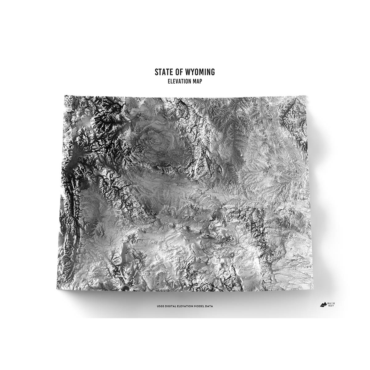 Explore the diverse and beautiful terrain of Wyoming and all of its distinctive character revealed within the detail of this relief map. Through the use of DEM data from the USGS, Muir Way magnified the features of its terrain by exaggerating their elevations and applying hillshade. The effect is one that will provide you with endless opportunities to investigate the compelling landscape of Wyoming.